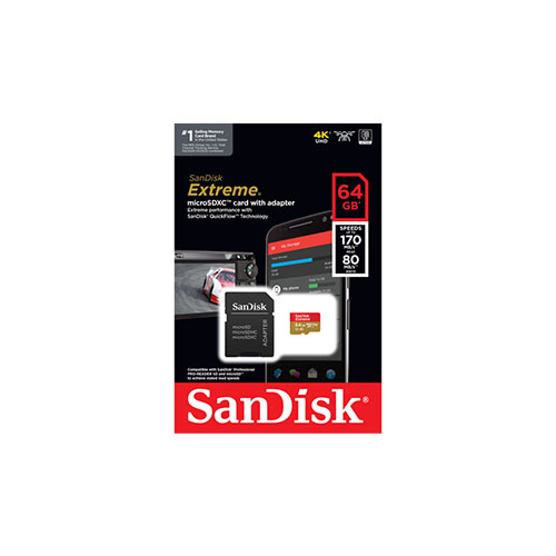 Conçue pour les caméras d’action et les appareils mobiles, la carte mémoire microSDXC Extreme UHS-I 64 Go de SanDisk offre une capacité de stockage de 64 Go et prend en charge des vitesses de lecture maximales de 170 Mo/s et des vitesses d’écriture maximales de 80 Mo/s. Cette carte a également été conçue avec la classe de vitesse vidéo V30, qui garantit des vitesses d’écriture minimales d’au moins 30 Mo/s. Tout cela permet aux utilisateurs de s’immerger dans la vidéographie et la photographie de sports extrêmes à des résolutions Ultra HD 4K (3840 x 2160) et Full HD (1920 x 1080).